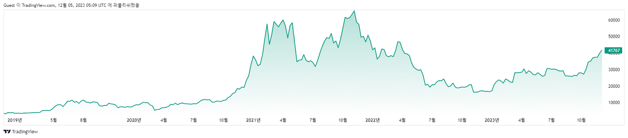 위에 나오는 그래프는 2019년부터 2023년 12월 4일까지 달러로 표시된 비트코인 가격 변동 그래프다. 2020년 10월부터 상승하기 시작한 비트코인 가격은 2021년에 역사상 최고치를 기록하였다. 그 후 등락을 거듭하다가 2022년 3월 28일을 기점으로 비트코인 가격은 본격적으로 하락했다.