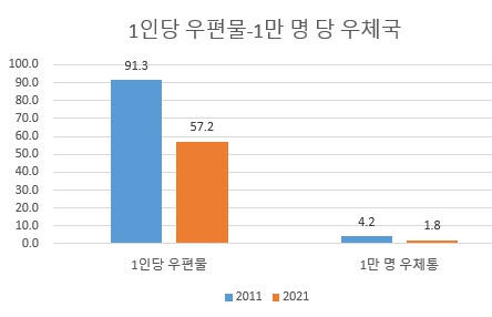 정이 담긴 우편물은 사라지고, 우편함에는 세금 고지서만 남았다. 1인당 우편물 숫자는 2011년 1인당 91.3개에서 10년 만에 57.2개로 많이 감소했다. 공공 기관이나 금융 기관이 발송하는 우편물을 빼고, 순수하게 개인 우편물을 계산하면 이 숫자는 더 큰 폭으로 감소한다. 당연한 결과지만, 인구 1만 명 우체통 숫자는 같은 기간에 4.2개에서 1.8개로 대폭 줄었다. 우리는 어느새 손 편지를 멀리 던져버렸다.