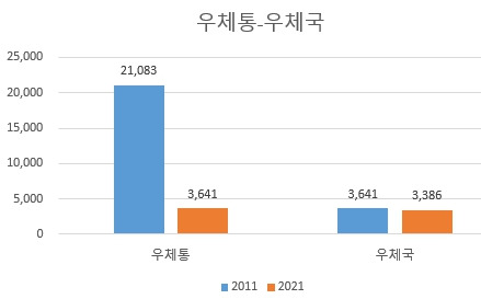 '손 편지'를 내던진 우리는 더 깊은 정을 나누는가? '손 편지'라고 하면 빨간 우체통이 먼저 떠오른다. 우체통 숫자가 줄어든 2011년에는 숫자가 21,803개였는데, 2021년에는 3,041개로 약 83%나 줄었다. 우체국의 숫자도 3,641곳에서 3,386곳으로 줄었다. 스마트폰과 SNS에 길든 사람들이 손 편지를 쓰지 않은 결과는 고스란히 우체통 숫자 격감으로 나타났다. 우체국 숫자가 상대적으로 적게 감소한 것은 우체국 직원의 감원이 어렵기 때문일 것이다.