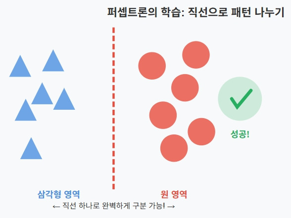 퍼셉트론은 직선 하나로 패턴을 나누는 방식으로 학습한다. 삼각형과 원을 구분할 때는 이 방식이 잘 작동했다. 직선 하나만 그으면 삼각형 그룹과 원 그룹을 깔끔하게 나눌 수 있었기 때문이다.