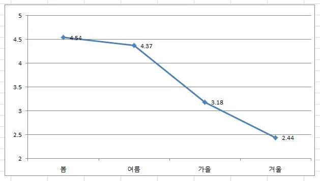 1982~2012년간의 계절별 일조량의 변화를 나타내는 그래프다. 봄과 여름의 일조량이 가을이 되면 뚝 떨어지는 것을 볼 수 있다. 겨울 일조량이 제일 적지만, 일조량이 갑자기 떨어지는 가을이 더 문제다. 햇빛의 양이 급속히 줄어드는 탓에 몸이 예민하게 반응한다. 멜라토닌과 세로토닌의 변동으로 잠이 많아지고, 기분이 가라앉는다.