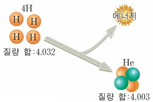 그림에서 4개의 수소 원자핵의 질량을 합하면 4.032다. 이것이 융합되어 만들어진 헬륨 원자핵의 질량은 4.003이다. 둘 사이에는 약 0.029(약 0.7%)의 질량 차이가 생겼다. 이 감소한 만큼의 질량이 에너지와 빛을 만든다. 이때 만들어지는 에너지의 크기는 0.029에다 빛의 속도(초속 약 30만 킬로미터)의 제곱을 곱한 값이다. 태양 내부에서는 매초 7억 톤의 수소가 헬륨으로 변환되고 있다. 이 과정에서 태양은 어마어마한 양의 에너지와 빛을 방출한다.