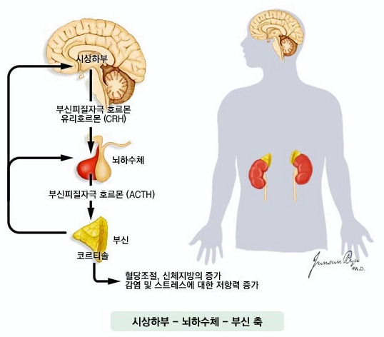 일상생활에서 경험하는 갑작스러운 사고나 가족과의 이별, 경쟁이 주는 경쟁적 손실 등은 스트레스의 원인이다. 스트레스 요인이 감지되면, 그 정보는 감정을 관리하는 뇌의 편도체에 전달된다. 편도체는 다시 이 정보를 뇌의 시상하부에 전한다. 시상하부는 호르몬 분비를 조절하는 뇌하수체가 부신피질을 자극하여 스트레스 대항 물질을 만들도록 명령한다.