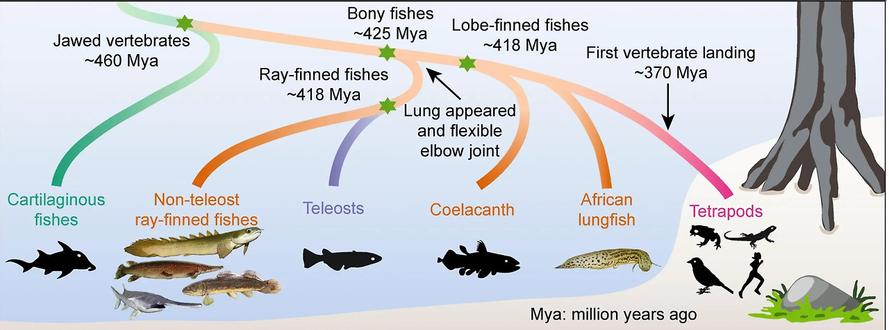 약 5억 9,000년 경이되면 선명한 신체 구조와 뚜렷한 신경제계(nervous system)를 갖춘 해파리와 말미잘 등이 등장했다. 이들은 바다를 떠나서 살 수 없다. 무척추동물이 폭발적으로 증가한 후, 드디어 등뼈 등 골격을 가진 ‘척추동물’이 등장한다. 초기의 척추동물은 수천만 년이 지난 후에 물고기로 진화했다. 약 3억 5천만 년 전이 되자 대부분의 물고기는 물을 떠나지 않았는데, 그중 아가미와 허파를 가진 한 종류가 무리 지어 땅 위로 올라왔다.