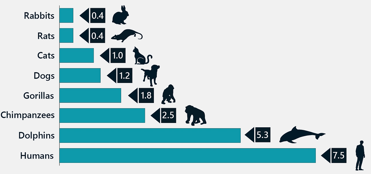 위의 대뇌화 지수 그래프를 보면, 인간의 수치가 7.5, 돌고래 5.31, 침팬지 2.49, 아프리카코끼리 1.87, 개 1.17, 고양이 1, 악어 1로 나온다. 인간의 뇌는 다른 동물들에 비해 큰 편이지만, 체중과 뇌 무게의 비율을 고려하면 압도적인 크기다. 우리가 흔히 알고 있는 동물들의 지능과 대뇌화 지수가 거의 맞아떨어진다.