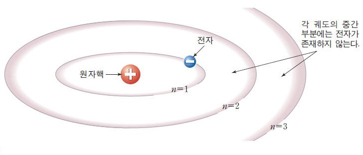 전자는 원자핵을 중심으로 두고 일정한 궤도를 이루면서 돌고 있다. 이때 전자가 움직이는 궤도는 에너지의 크기(에너지 준위)를 갖는 특정한 궤도를 따라 회전한다. 위 그림에서 원자핵에 가까운 궤도의 에너지 값이 1의 궤도(n=1)를 따라 전자가 회전하거나 아니면 에너지값 2의 궤도(n=2) 혹은 에너지값 3의 궤도(n=3)에서 회전한다. 그 사이의 에너지 값, 즉 1.01~1.99, 2.01~2.99 사이의 궤도에서는 전자가 존재하지 않는다.