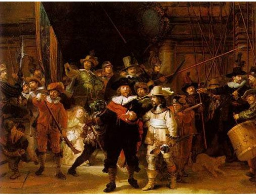 1642년 렘브란트는 역사에 길이 남을 걸작 <야경(1642)>을 그렸다. 이 그림을 통해 그는 위대한 화가의 반열에 오른다. 민병대원들이 야간순찰을 나가기 위해 모여서 점검하는 장면을 그렸다. 여기서 빛과 어둠의 강렬한 대비를 통해 사람들의 긴장감을 잘 표현했다. 지휘관이 손을 들어 행동 요령을 설명하고 있고, 나머지 대원들이 그의 말에 귀를 기울인다. 어떤 사람은 딴 곳을 응시하기도 하고, 또 어떤 사람은 옆 사람을 쳐다본다.