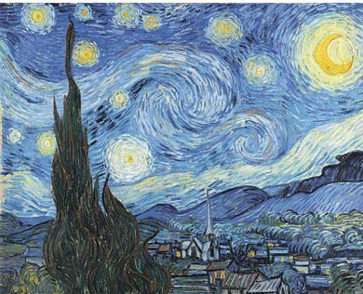 생레미 정신병원에 탄생한 그림이 바로 ‘별이 빛나는 밤(the starry night)’이다. 곧게 뻗은 사이프러스 나무 뒤의 마을과 교회의 첨탑은 깊은 침묵에 싸였다. 그의 ‘별밤’ 속 구름은 격렬하게 소용돌이치고 별빛은 거칠게 반짝인다. 밤하늘에는 두꺼운 물감과 거친 붓 흔적이 고스란히 남았다. 하얀 캔버스 위에는 수억 광년을 달려온 별들이 거친 숨소리를 내며 별빛을 쏟아낸다. 종이가 찢어질 듯한 강렬한 붓 터치는 터질듯한 고흐 내면의 혼돈을 보여준다.