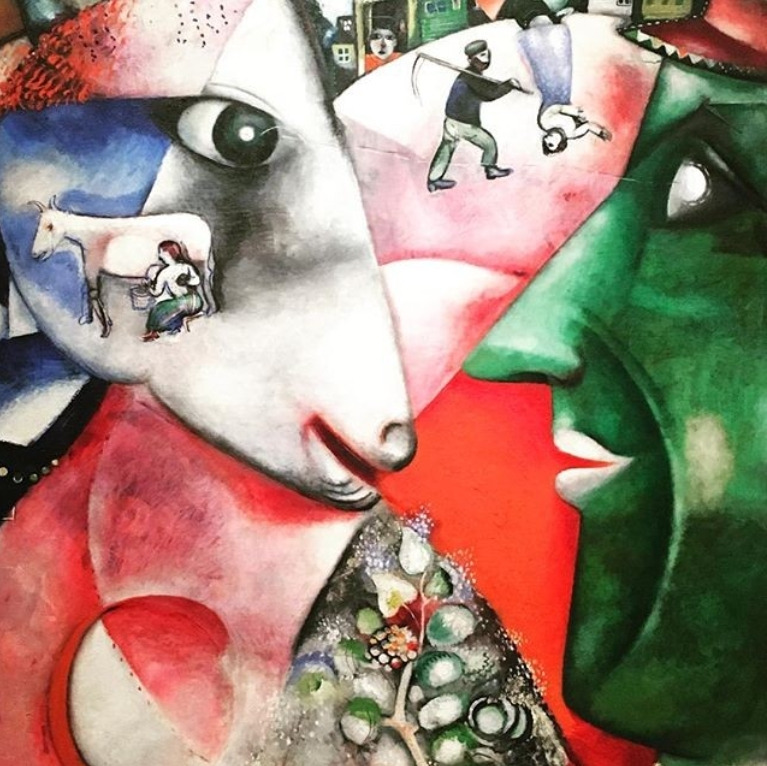 <나와 마을(1911)>은 고향을 그리워하는 샤갈의 마음이 그대로 드러난다. 마주한 커다란 암소 얼굴과 초록색의 사람 얼굴, 강렬하고 원색적인 색채의 대비는 고향의 유대인 전통을 표현한 것이다. 그의 그림에서 빠지지 않는 초록색은 고향을 그리워하는 마음을 뜻한다. 꿈과 현실이 구분되지 않는 몽환적인 그림에서 샤갈의 상상력과 간절함이 돋보인다.