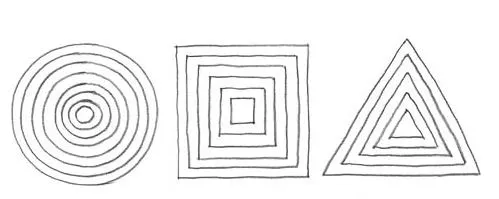 선 긋기가 어느 정도 익숙해지면 도형을 매끄럽게 그린다 작은 동그라미를 중심으로 점점 큰 동심원을 그려 본다. 선과 선 사이가 일정한 간격을 유지하고 형태가 일그러지지 않도록 하는 것이 요령이다. 같은 방법으로 사각형과 삼각형을 연습하면 도형 그리기에 자신감이 붙는다.