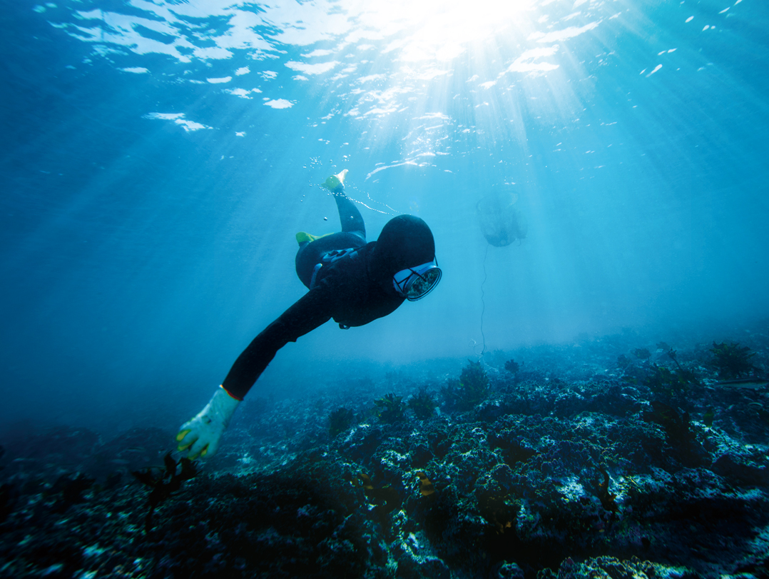 신선하고 좋은 해산물을 얻기 위해 해녀는 하루에 몇 번씩 깊은 바닷속에서 물질한다. 제대로 된 장비 하나 없이 맨몸으로 물속으로 뛰어든다. 싱싱한 소라나 고등을 구하기가 쉬운 일은 아니다. 숨이 막히는 고통을 견디며 한 길 넘는 바닷속을 헤집는다. 해초 다발 사이에 숨어 있거나 바위 틈새에 위장한 놈들을 일일이 손으로 거둬야 한다. 시간이 흘러 물 위로 올라온 해녀의 걸망에는 청정한 해산물이 한가득하다.