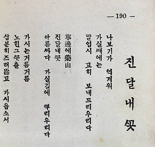 김소월 시인의 ‘진달래꽃’의 일부다. 뭐 대한민국 사람이면 웬만하면 다 아는 시다. 너무 유명해 별다른 설명이 필요 없다. 한국인이 가장 좋아하는 시 중에 하나다. 이별의 아픔을 속으로 삼키는 애잔함 때문이다.