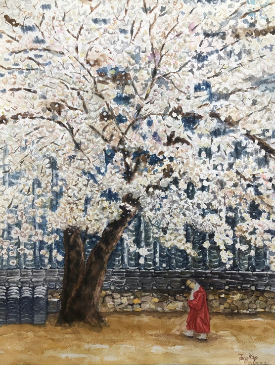 구례 화엄사에 벚꽃이 활짝 폈다. 흐드러지게 핀 하얀 꽃잎 아래 스님께서 깊은 묵상에 잠겼다. 흙 돌담과 검푸른 기와지붕에도 하얀 꽃잎이 드리웠다. 화실에 다닌 지 2년째 되던 해에 내가 그린 그림이다. 그림 그리는 내내 스님은 무슨 생각을 하실까 궁금했다. 해마다 봄이 오면 이 그림을 뚫어지게 본다. 그때마다 스님의 생각에 관한 궁금증이 머리에서 떠나지 않는다.