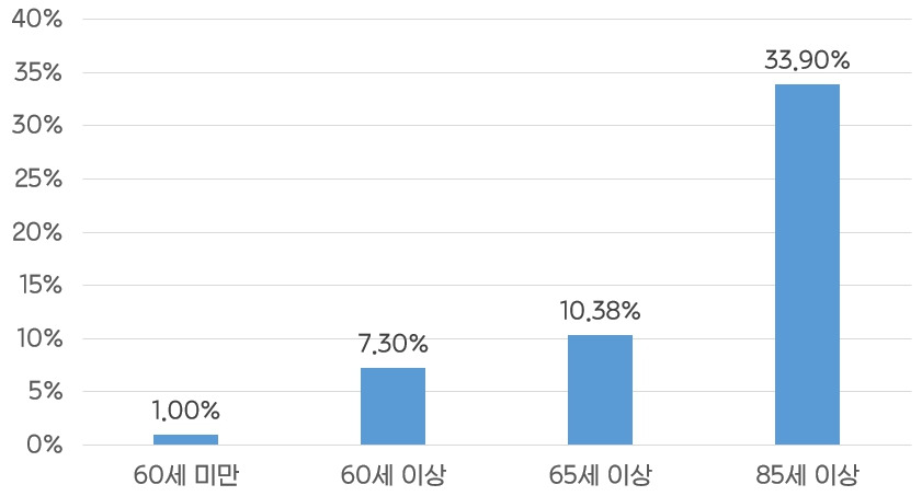 2022년 60세 노인 인구 13,153,957명 가운데서 960,556명이 치매 환자다. 비율로는 노인 인구 가운데 치매 환자는 7.3%가 된다. 65세 이상 노인 인구 9,010,545명 가운데 약 935,087명이 치매 환자로 비율이 10.38%로 증가한다. 60세 이전에 발병하는 젊은 치매 환자는 약 9만 명이나 된다. 젊은 치매 환자의 수도 그리 작지 않은 숫자이다.