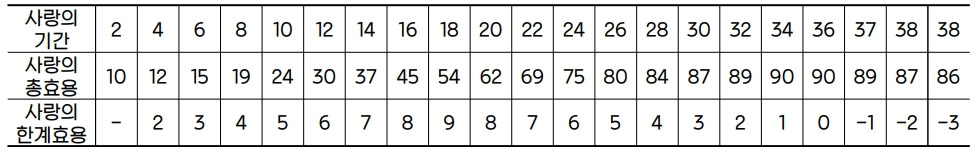 이것을 경제학의 한계효용체감의 원리로 설명하면 다음과 같다. 사랑의 묘약이 유지하는 기간을 36개월로 잡았다. 그리고 그 반이 되는 시점인 18개월째 사랑의 강도가 차츰 식는 사랑의 변곡점으로 설정했다. 그사이에 어떤 일이 일어나는지를 표로 정리했다. 사람마다 느끼는 사랑의 기쁨과 슬픔의 정도는 다 다르다. 필자가 글을 풀어가기 위해 아래의 수치를 예로 들었다.