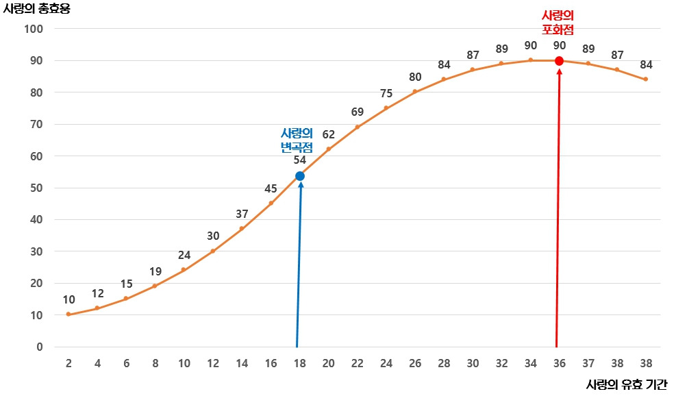 그래프를 보면 사랑에 빠진 지 18개월쯤 되면 사랑의 변곡점을 만난다. 이제 사랑의 약발이 다하는 36개월째가 되면 사랑의 한계효용은 0이 된다. 이때가 되면 예전의 뜨거움과 열정은 사라진다. 정절에 달한 사랑의 불꽃이 잦아들기 시작한다. 그 후부터는 사랑의 한계효용이 마이너스로 돌아선다. 영원할 것 같은 사랑의 불꽃이 사그라들 위기에 봉착한다.