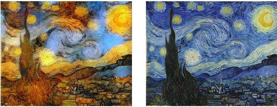 두 그림은 대상과 표현 기법, 붓질은 같은데 색깔이 다르다. 왼쪽은 구글의 AI 딥 드림(Deep Dream)이 그린 그림이고, 오른쪽이 고흐의 그림이다. AI가 같은 색깔을 사용했다면 두 그림은 같다고 해도 좋을 만큼 비슷하다. 전문가조차 구분하기 힘들었을지도 모른다.