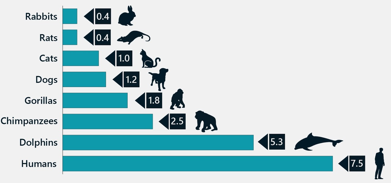우리는 동물의 두뇌 발달 정도를 평가할 때 대뇌화지수(Encephalization quotient, EQ)와 뇌 신경세포의 숫자를 기준으로 활용한다. 이 두 개의 수치가 높을수록 지능지수가 높다. 물론 예외 없는 법칙은 없지만, 대략 이 수치가 높은 동물이 IQ가 보면 된다.