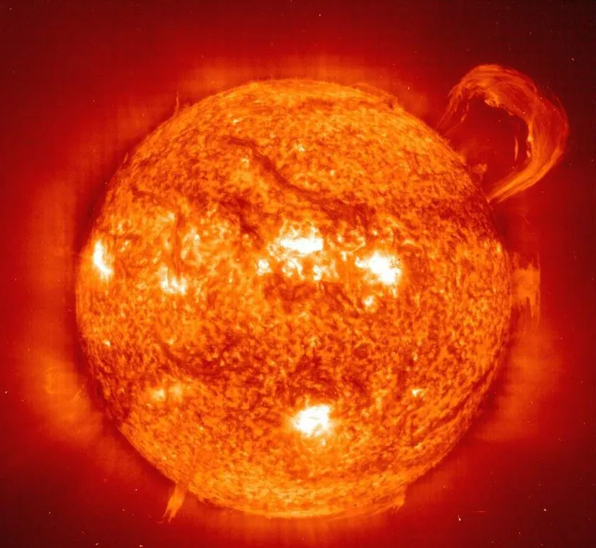 자, 다시 정리해 보자. 태양 내부의 수소 원자는 플라스마 상태야. 전자와 분리된 핵이 빠르게 움직이는 조건이 충족돼 있어. 태양 내부의 엄청난 압력으로 초고속으로 충돌한 핵은 융합해. 이 과정에서 감소하는 질량은 엄청난 양의 에너지와 빛을 만들어. 실제로 태양 내부에서는 1초에 약 5억 9천7백만 톤의 수소가 5억 9천3백만 톤의 헬륨으로 바뀐다고 해. 거기서 손실되는 400만 톤의 질량은 빛의 속도에 제곱을 곱한 크기의 에너지를 만드는 거야.
