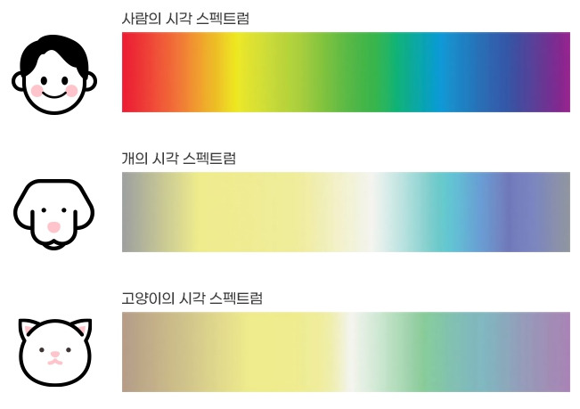 인간 외에도 여러 포유류들은 원뿔세포를 가지고 있지만, 세 가지 종류의 원뿔세포를 모두 갖춘 것은 인간뿐야. 개나 고양이는 빨간색 파장을 인식하는 원뿔세포가 없어서 빨간색을 정확히 인식하지 못해. 그 대신 주로 파란색과 노란색 스펙트럼의 빛에 반응하지. 이 때문에, 개나 고양이는 빨간색을 갈색이나 회색처럼 본다고 해. 결국, 빨강, 파랑, 녹색의 원뿔세포를 모두 갖춘 인간에 비해 개나 고양이는 색의 다양성을 덜 느끼며 살고 있어.