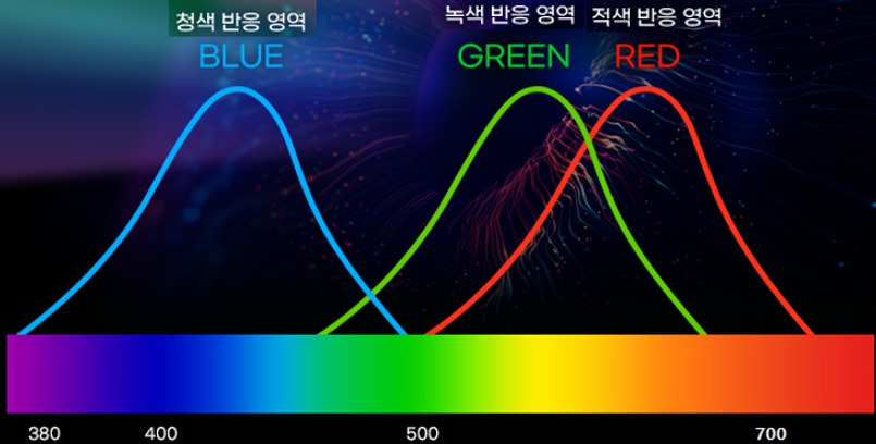 우리가 색채를 인식하는 건 원뿔 세포 덕분이야. 빨강, 파랑, 녹색의 원뿔세포가 조합해서 색을 만드는 거지. 원뿔세포의 적색 반응 영역은 450~750nm의 파장이고, 노란색에서 빨간색을 인식하자. 녹색 원뿔세포는 400~675nm 파장으로 녹색과 파랑의 색에 반응해. 청색 원뿔세포는 380~550nm 파장의 파란색과 보라색 사이의 빛에 반응하는 영역을 갖고 있어. 빛의 삼원색은 이들 세 종류의 원뿔세포들이 인식하는 빨강, 초록, 파랑을 말해. 세 종류의 원뿔세포가 서로 섞이면서 다양한 색을 인식하는 거야.
