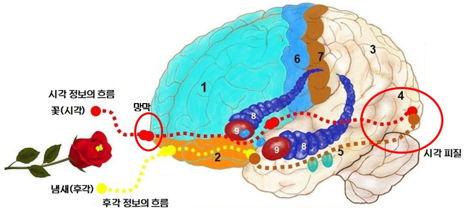 눈은 외부의 정보를 가장 많이 받아들이는 감각기관이야. 미각은 1%, 촉각은 2%, 후각은 4%, 청각은 10%로 정보를 전달하는 반면, 나머지 83%는 시각을 통해 전달돼. 그런데 시각 기관이라는 것은 눈의 망막만을 의미하는 것은 아니야. 시각 정보의 전달과 처리는 눈의 망막, 시신경, 그리고 뇌의 시각 피질을 포함한 복잡한 구조를 통해 이루어지지.