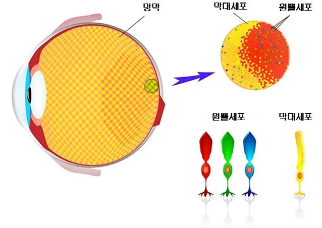 망막 내부에는 주로 두 종류의 시각 세포가 존재하지, 그건 막대세포(간상세포, rod)와 원뿔세포(원추세포, cone)야.