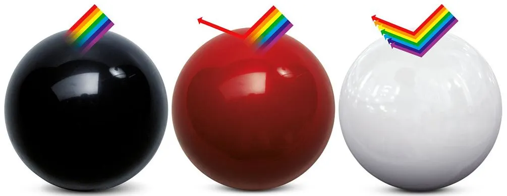 검은색 공은 빛의 모든 색을 흡수하여 아무것도 반사하지 않아. 그러므로 무지개색 빛이 검은 공에 부딪히면, 색이 그냥 사라진고 검은색 그대로야. 빨간색 공은 다른 색은 모두 흡수하고 오직 빨간색 빛만을 반사해. 다른 색은 모두 흡수될 것이다. 하얀색 공은 모든 색을 다 반사하기 때문에, 무지개색의 가시광선을 그대로 반사해. 이렇게, 물체의 색은 해당 색의 빛만 반사하고, 나머지는 색은 모두 흡수하는 원리를 가졌어.