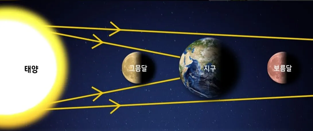어젯밤은 날이 흐려서 둥근달을 볼 수 없었어. 오늘 밤 달은 지구의 반대편에서 태양 빛을 가장 환하게 받을 거야. 태양, 지구, 달이 한 줄로 놓이게 되면 둥근 보름달을 볼 수 있지. 반대로, 달이 태양과 지구 사이에 위치하면 달의 어두운 면만 보여. 이렇게 아주 어둡게 보이는 달이 그믐달이야.