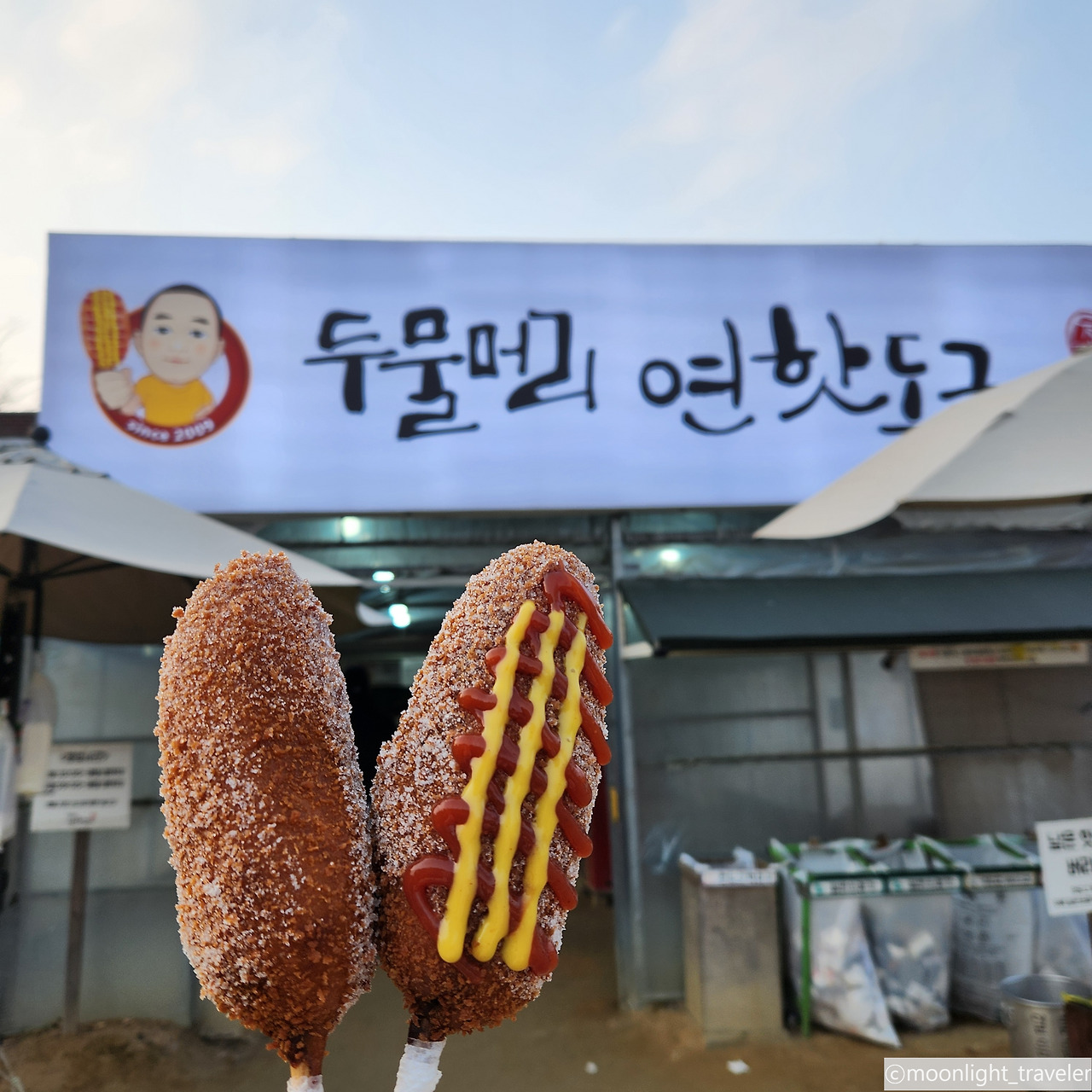 나루터까지 산책하고 나니 핫도그 가게 줄이 그세 다 사라져 버렸다. 잽싸게 가서 핫도그 2개를 고른다. 순한 맛, 매운맛. 매운 핫도그는 나의 것. 이미 빵으로도 배가 불렀지만 핫도그는 맛봐야 하지 않겠냐며. 오. 역시 다르네. 한입 베무니 따뜻하고 바삭바삭한 튀김옷과 소시지가 나를 반긴다. 연잎을 갈아서 밀가루와 반죽하여 속살이 연두색빛. 그래서 연핫도그란다. 바사삭바사삭. 맛있어, 맛있어. 핫도그를 별로 먹어본 적도 없지만 이런 핫도그는 처음이야. 다행히 아이들도 맛있게 먹는다. 여기까지 온 보람이 있군. 또 언제 올지 모르잖아. 먹어 먹어, 즐겨 즐겨.