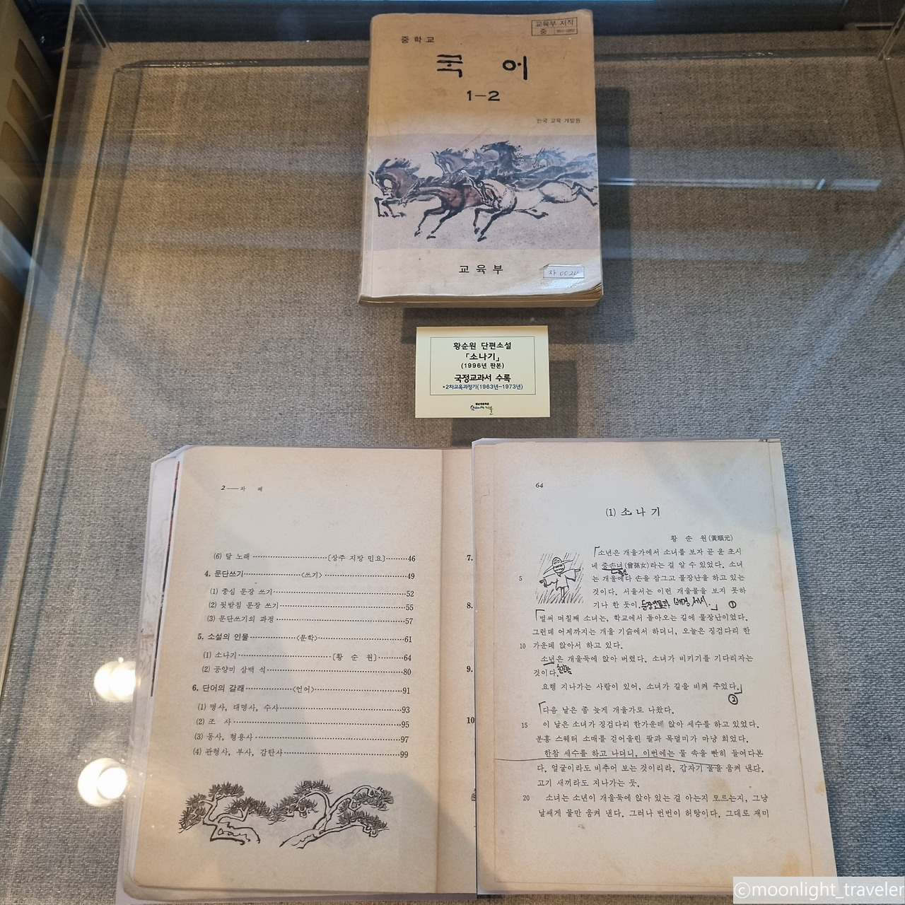 여름에는 잔디 마당에 설치된 인공분수대에서 물도 뿜어져 나온다고 하는데 우리가 찾은 11월은 추운 겨울이기에 운영하지 않는다. 아쉬움을 멀리하고 문학관에 들어가니 세상에. 중학교 1학년 때의 국어교과서가 전시되어 있다. 중학교 입학하자마자 받았던 낯선 국어 교과서. 크기는 작은데 얼마나 두껍던지. 게다가 글씨는 깨알같이 빽빽했으며 표지에 그려진 수많은 말의 달리는 그림은. 중학교 생활의 점수가 고등학교 입시에 중요한 결정을 하는, 맹렬하게 달려야 하는 내 십 대와 별반 다를 게 없었다. 그랬던 교과서가 번듯하게 전시되어 있다.