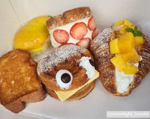 한껏 문학관을 구경했더니 슬슬 배가 고파져 이왕이면 맛있는 커피와 빵을 먹어보기로 한다. 근처에 유명한 베이커리 가게가 있어 온 김에 가본다. 들어서니 역시나 주차장도 넓고 카페는, 와우. 고즈넉한 한옥 풍경의 좌식, 온돌도 있으며 야외도 자리가 마련되어 있다. 이들은 어디에서 알고 왔는지 곳곳마다 사람이 가득 차 있다. 역시 맛집이군. 우리는 지나가는 길이였기에 각자 먹고 싶은 빵을 골라 포장하기로 한다. 사진에는 안 나와있지만 '소복소복'이라는 빵이 베스트라 하여 골랐는데 정말 빵이 소복소복하고 맛이 깔끔한 게 제일 맛있었던 빵이라고 엄지를 치켜들며 추천한다. 사진에서 어떤 빵이 마음에 드실지. 아이들은 과일을 좋아해서 빵도 딸기와 망고가 들어있는 빵을 골랐다. 중요한 건 점심을 먹고도 우리 가족은 이 빵을 5분 만에 해치웠다는 것.