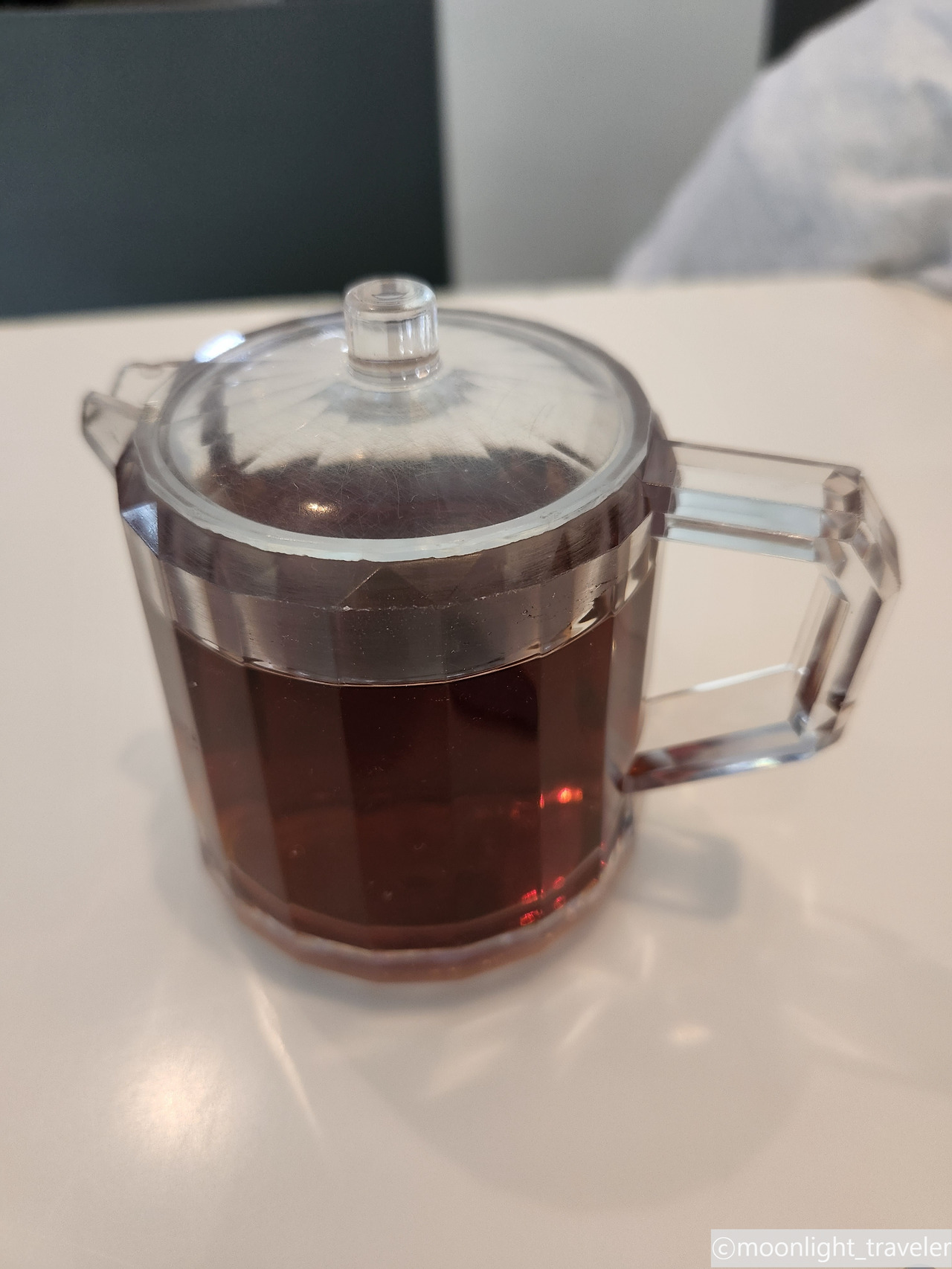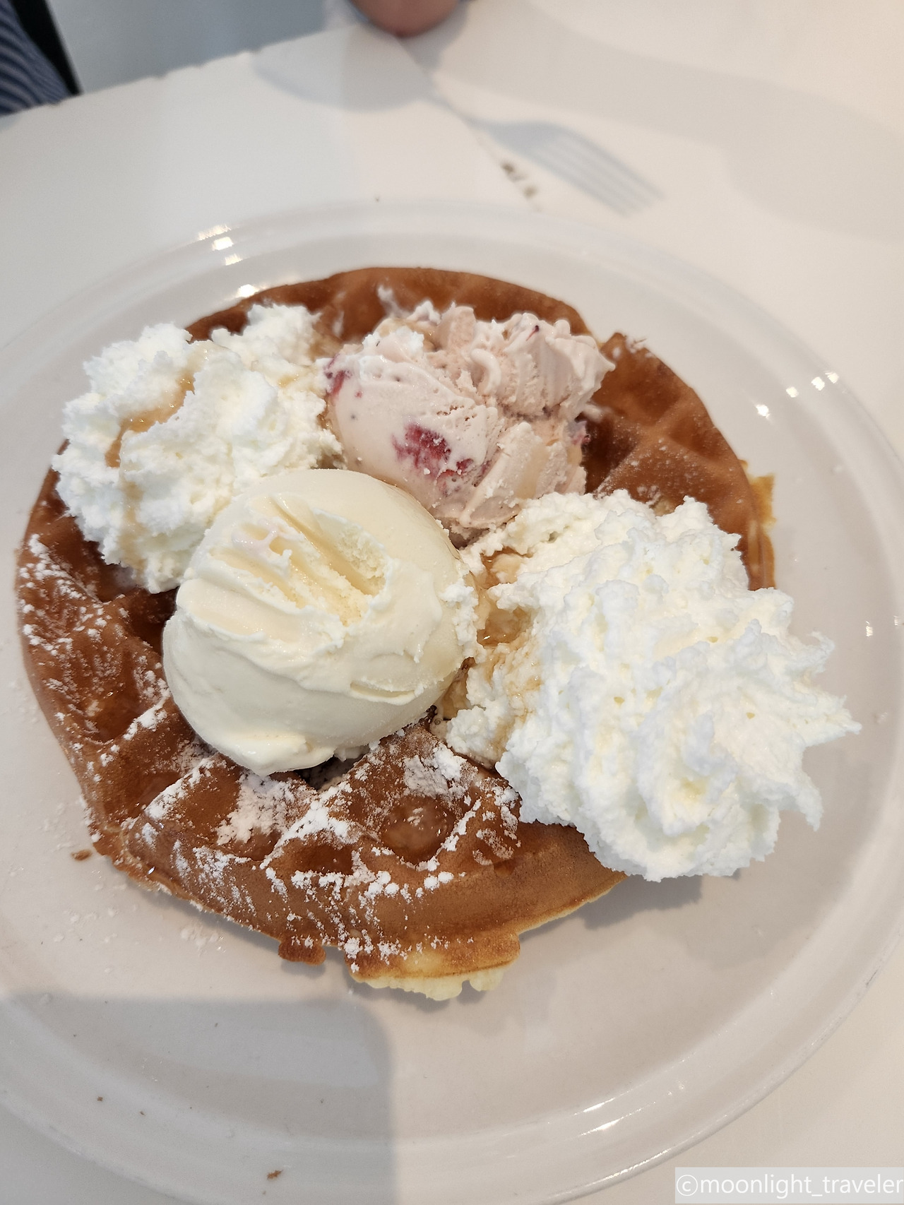 예쁜 주전자 모양의 그릇에 시럽이 가득 담겨 나왔으니 맛은 봐야 하지 않겠냐며 시럽을 와플 위로 살살 뿌린다. 그리고는 나이프와 포크를 이용하여 와플을 조금씩 자른다. 생크림은 좋아하지 않지만 아이스크림과 와플 맛에 버무려지기를 바라며 조금씩 베어 분다. 겉은 바삭하면서도 스펀지케이크처럼 푹신푹신한 식감. 시럽을 뿌렸기에 달콤하면서도 쫀득쫀득한 하겐다즈 아이스크림이 맛을 극대화하며 입에서 살살 녹는다. 역시 맛있다.