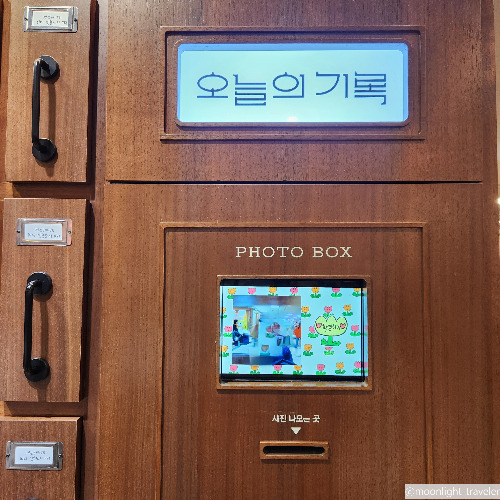 자랑스러운 한강 작가의 책을 살펴보고 왼쪽으로 돌아서면 만나게 되는 '오늘의 기록'. 교보문고 곳곳에 흩어있던 남편, 사랑이, 기쁨이를 불러 모은다. 사진 한 번만 찍자, 잠깐만 읽는 거 멈춰봐, 사진 찍고 다시 읽자,라는 얼렁뚱땅 설득과 함께 후다닥 모여 카메라 앞에 선다. 이런 포토박스라니. 그냥 넘어갈 수는 없지 않은가. 한껏 포즈를 취하고는 '스마일'하며 얼굴에 잔뜩 미소를 띠고 촬영하기 버튼을 누른다. 파란색 종이 위에 흑백으로 출력되는 가족사진. 멋들어지게 출력된 흑백 사진이 가족 모두에게 미소를 선사한다. 우리는 오늘도 오늘을 기록한다, 우연찮게 서점에서. 집에 가서 냉장고에 붙여 둬야지.