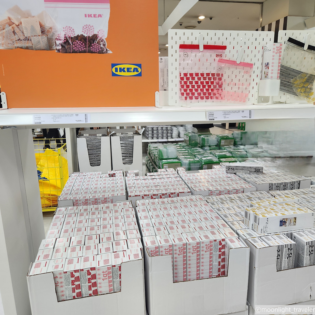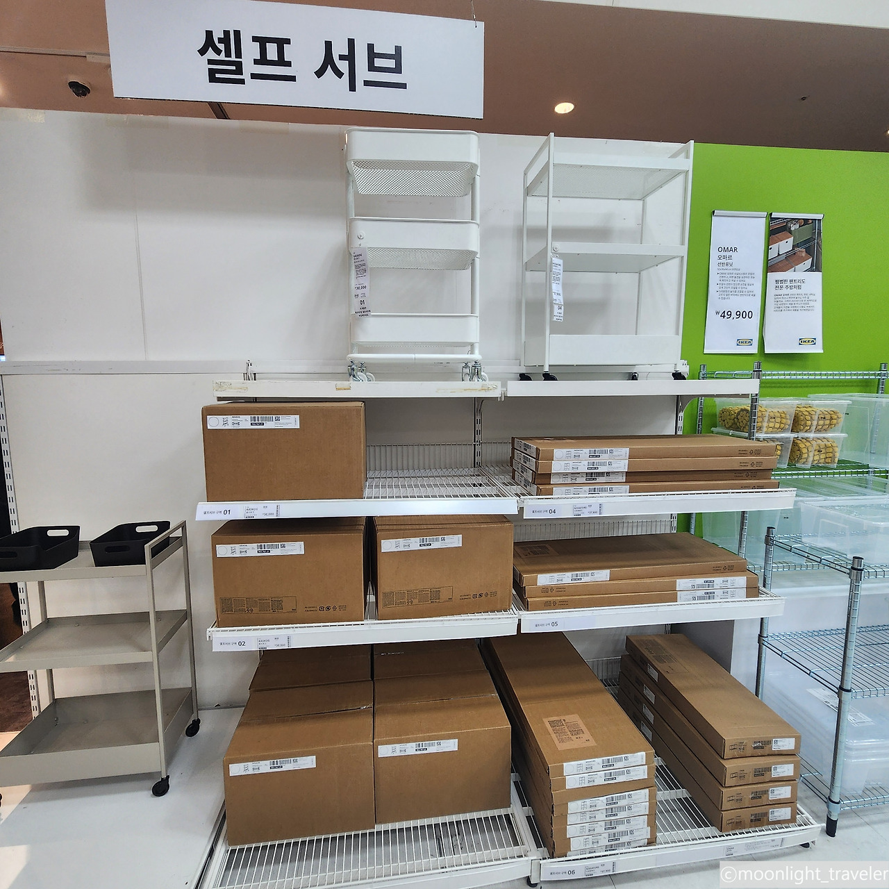 결국 모든 물건을 보지도 못한 채 그저 산책하기 위해 온 것인지, 물건을 구입하기 위해 온 것인지 목적을 잃어버린 채. 말 그대로 마트 투어만 한 셈이 됐다. 쇼룸 끝에는 쇼룸에 전시된 물품의 박스들이 창고처럼 쌓여 있었다. 여기서 물품의 번호를 찾아 구매하는 것. 사람들은 끌개를 가지고 와서 박스들을 몇 개씩 담아 놓고는 계산대로 향하고 있다. 저렇게 구매하네. 신박하다. 필요한 제품의 부품을 구매해서 집에 가서 조립하는 방식이라니. 어쩌면 그래서 가격이 더 착할지도.