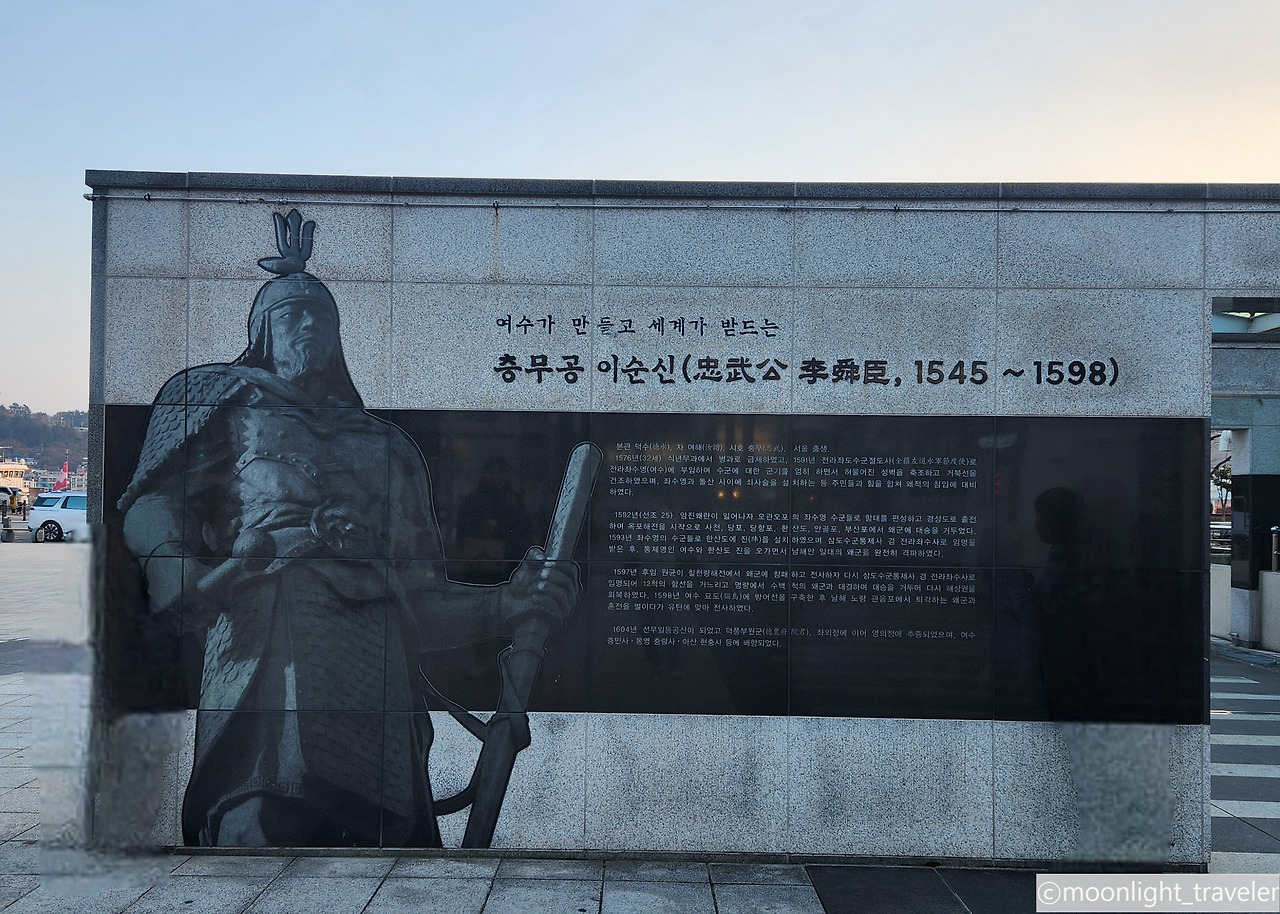 광화문대로에 있는 이순신 동상. 그곳 지하에는 이순신 장군과 관련된 영상 및 각종 체험을 할 수 있는 공간이 있다. 그런데 이 여수는 바로 그 역사의 현장이 아니던가. 여수 밤바다를 보러 왔지만 이순신 광장도 빼놓을 수 없다. 이순신 광장 중앙에는 늠름한 이순신 동상이 서 있으며 바닷가 쪽으로 조금만 걸어가면 이순신 장군의 일대기와 임진왜란의 과정을 담은 벽화를 볼 수 있다. 아이들과 함께 읽어가며 이순신 장군에 대해 조금 더 알아간다.