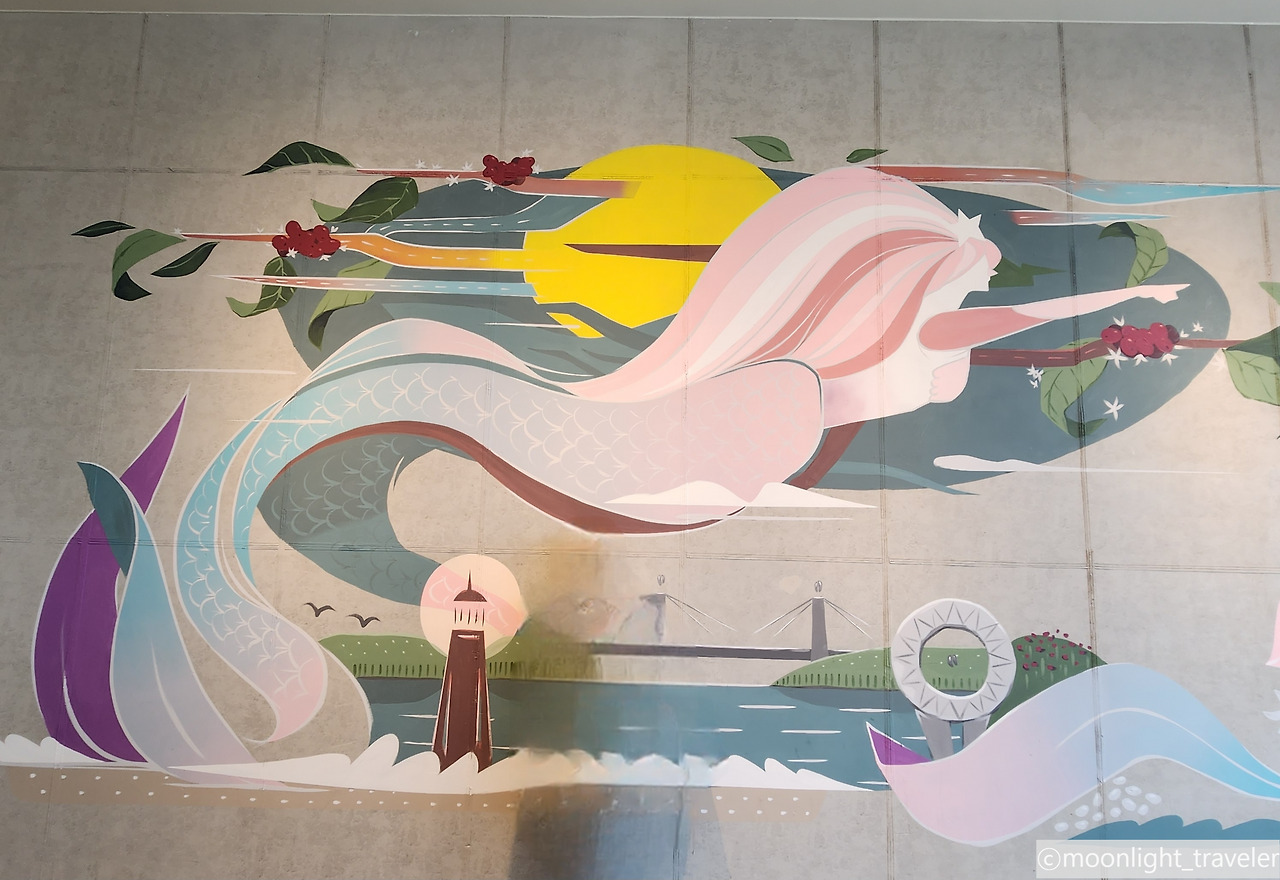 꼭 커피를 마시려고 간 것은 아니었다. 여느 스타벅스와 다른 건물이라 해서 구경에 나섰다. 뭐, 간 김에 따뜻한 카페라테 한잔을 마실 수 있다면 좋겠지. 돌산대교를 건너 돌산도로 들어갔다. 역시나 뷰(view) 맛집이라 이미 주차장이 만차에 대기줄도 있다. 어쩔 수 없이 스타벅스 건너편에 주차하고 걸어서 갔다. 얼마나 색다르기에. 들어서자마자 우리를 반겨준 것은 탁 트인 천장이었다. 높은 천장에 물결을 상징하는 오브제 모빌이 달려있다. 마치 바닷속의 헤엄치는 물고기처럼. 그리고 그 밑에는 큰 테이블이 있다. 이는 8m 길이의 투명 디스플레이 테이블로서 영상이 재생되고 있으며 손을 대면 영상이 변한다. 아이들이 옹기종기 모여 앉아 테이블에 손을 대며 물고기를 만져볼까, 파도를 만져볼까 하고 있다. 우리 아이들도 만져보려고 기웃거렸지만 이미 만석인 테이블이기에 자리 나기가 힘들다. 어수선하고 복잡하다, 밖에 나가자.