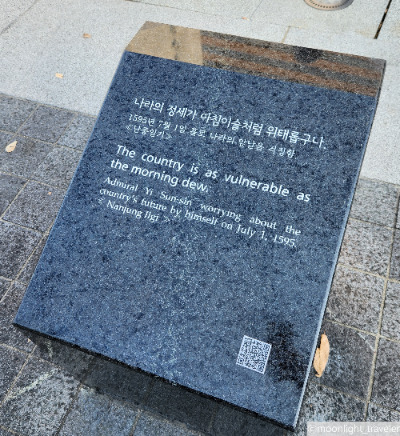 다른 이야기지만 저번에 광화문광장에 갔을 때 이순신 장군 옆에 새겨진 비석들을 봤었다. 비석마다 이순신 장군의 말씀과 일기 내용이 적혀 있다. 어찌나 한 마디 한 마디 글과 말씀이 정갈하고 우리의 마음을 콕콕 찌르는지. 마침 광화문 광장에 여러 가지 이유로 많은 사람들이 모여서 시위하는 모습들 속이어서 그런가. 유독 난중일기 중 '나라의 정세가 아침이슬처럼 위태롭구나.'라고 적힌 글귀가 마음에 들어왔다. 하나하나 아이들과 함께 읽어가며 그때의 이순신 장군의 마음을 읽어보려 애썼다. 시간이 되신다면 여수, 까지는 아니더라도 광화문 광장에 가보시길.