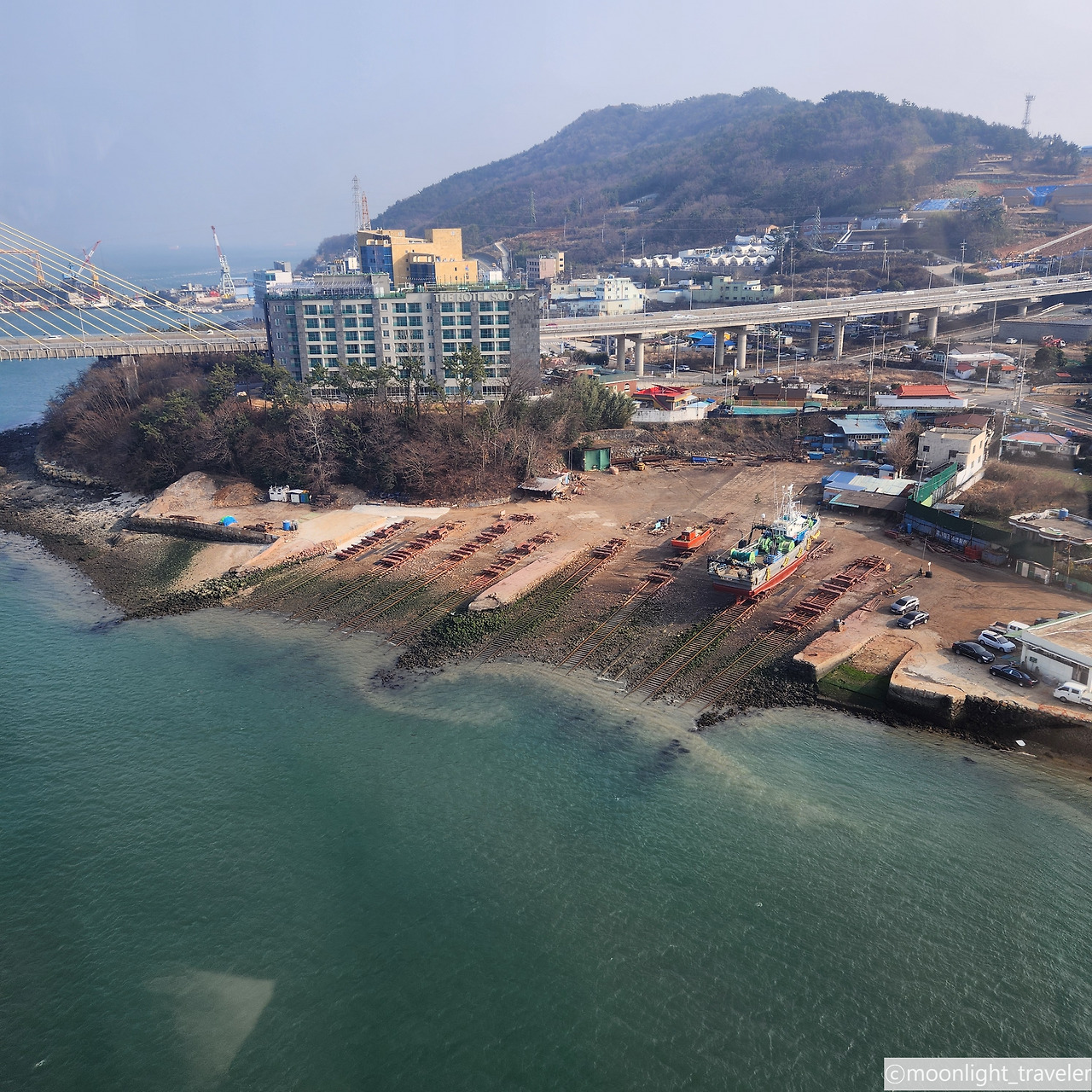 "오, 저기는 배를 수리하는 선소인가 봐. 땅에 뭐가 박혀있네. 배를 고치고 바다로 내려 보내고 육지로 다시 올리는 기능을 하나 보다. 신기하다. 저번에 EBS 세계테마기행에서 봤을 때 아프리카. 기억나지, 그 나라에서는 사람들이 다 함께 모여서 손으로 배를 밀어 바다로 보냈잖아. 직접 보는 건 처음이다."
