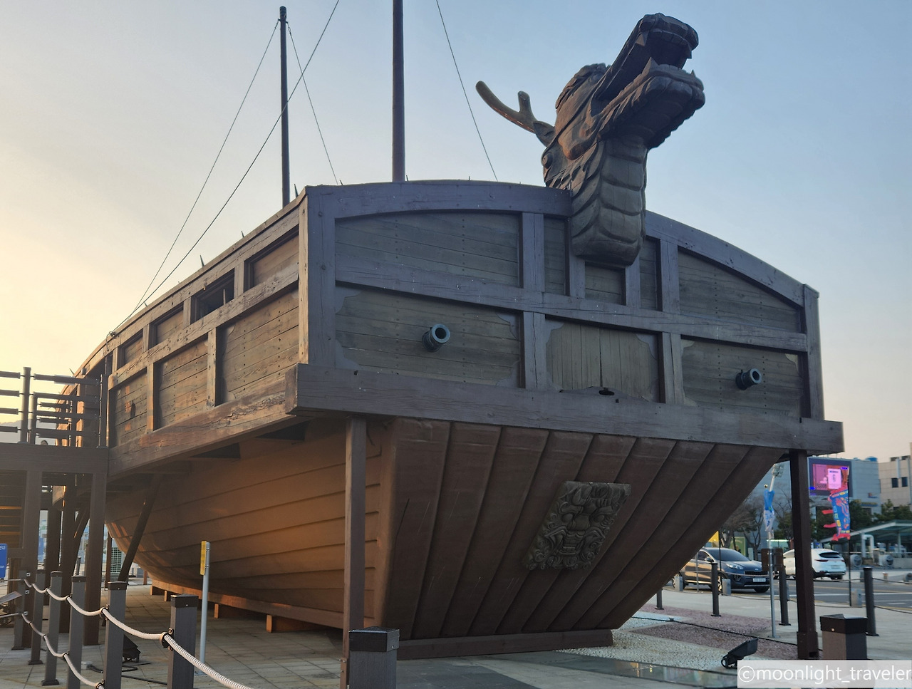 바닷가 쪽으로 더 내려가면 거북선을 볼 수 있는데 이는 2층구조로서 선체 내부를 관람할 수 있다. 거북선이 위치한 자리는 바로 전라좌수영 선소(배를 만들던 터)가 있던 곳이다. 무료로 입장이 가능하다. 안에 들어가면 수(水)군 밀랍인형의 노를 젓거나 포를 나르는 역동적인 모습을 볼 수 있다. 또한 장군복을 입고 장군이 될 수 있는 체험도 할 수 있다. 광화문에서 한 체험과 비슷하지만 이곳은 역사의 현장이기에 감회가 새롭다. 그 옛날 이곳에서 거북선을 만들고 왜적들의 침입에 대항했던 곳이라니. 서울에서 나고 자란 이순신 장군이 이 먼 곳 여수까지 올 수 있는 힘은 어디에서 나왔을까. 나라를 지키기 위함이겠지. 이 작은 바다와 지역을 지키는 것이 이 나라를 지키는 위대한 일임을 이순신 장군은 알고 목숨까지 바쳤겠지. 그의 용기와 혜안에 감탄을 한다.