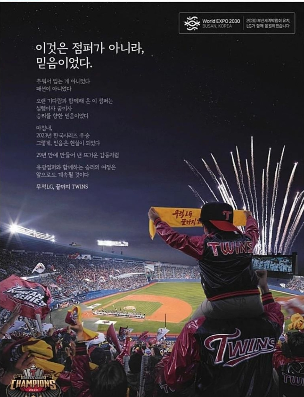 23년 한국시리즈 통합 우승으로 24년에는 더욱더 LG TWINS를 응원했다. 아이들은 틈만 나면 집에서든 길거리에서든지 야구 선수들(구단 상관없이)의 응원가를 불러댔으며 필자는 틈만 나면 (아이들 몰래) 야구 생중계 혹은 하이라이트를 보곤 했다. 단지 눈과 입으로 야구를 응원했느냐. 그것이 전부가 아니다.
