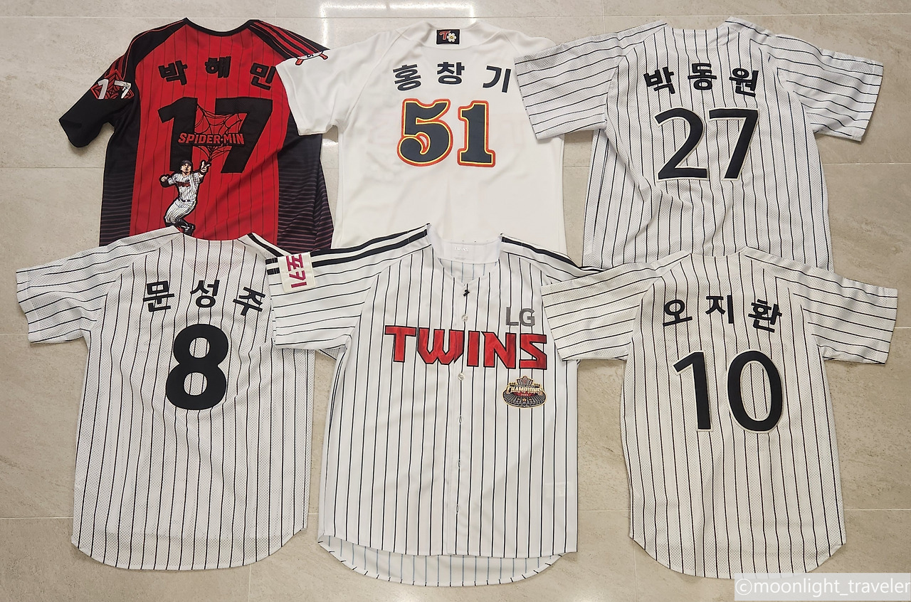 처음으로 잠실야구장에 가서 제일 먼저 한 일은 유니폼샵을 방문한 것이다. 먼저 유니폼 디자인과 사이즈를 골랐다. 그리고 등판에 선수 이름을 마킹해야 하지 않는가. 각자가 좋아하고 응원하는 선수 이름을 골랐다. 남편은 포수 27번 박동원선수, 나는 8번 문성주선수, 사랑이는 17번 박해민선수, 기쁨이는 10번 오지환선수. 이렇게 각자 유니폼을 고르고 마킹을 마쳤다. 진정으로 야구팬이 된 것 같은 이 기분. 더 열정적으로 야구를 응원해야 하는 명분이 생겼다. 유니폼이 한 벌 뿐인가. 이때 여동생 옷장에 걸려 있던 '양의지'선수의 유니폼 2벌의 이유를 알았다. 홈팀 경기와 원정팀 경기 유니폼이 다르다는 것. 어김없이 우리도 홈경기, 원정 경기 각각 유니폼을 구매할뿐더러 최애 선수의 플니폼(플레이어 유니폼) 및 기념구도 구매했다. 이는 매번 다른 유니폼을 입고 다니는 쏠쏠한 즐거움을 선사한다.