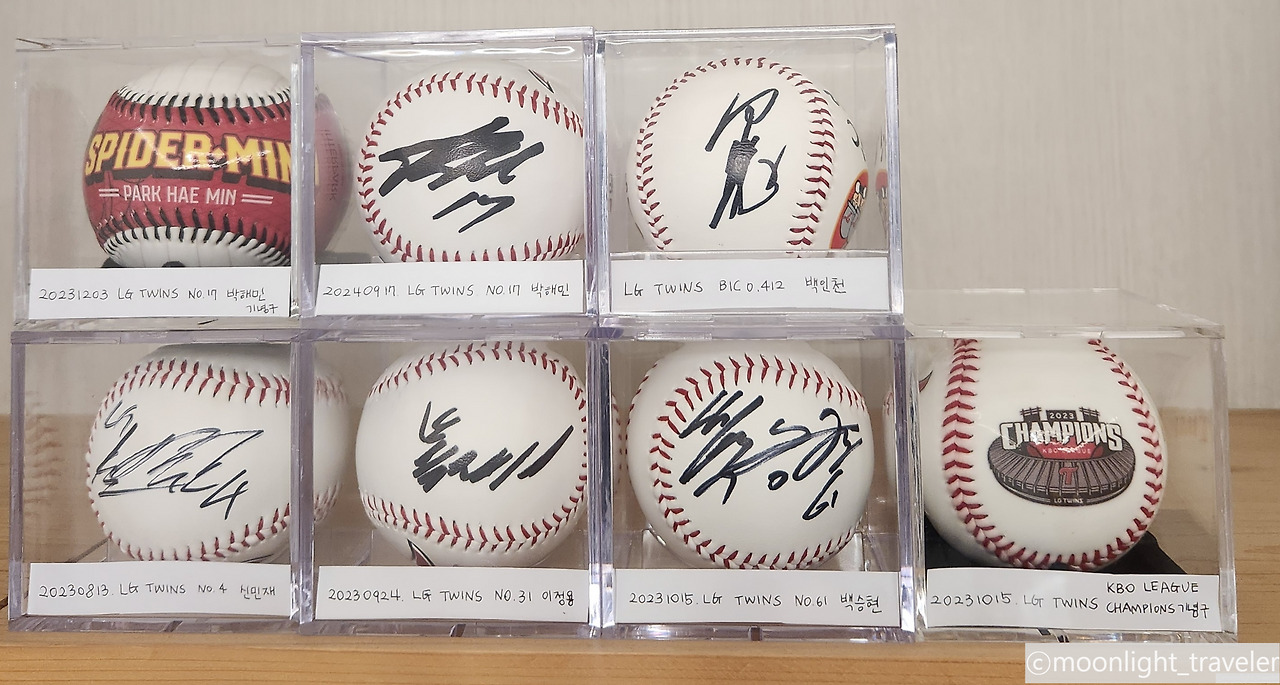 우연히 아이들이 캐치볼을 할 LG TWINS 야구공을 구매했다가 야구 선수에게 사인을 받게 된 이후로. 야구공 2개와 유성펜을 들고 다니면서 선수들에게 호시탐탐 사인받을 기회를 노리는 재미도 있다. 그렇게 인파를 뚫고 사인을 받아 거실 책장 위에 사인볼을 전시해 둔 것은 우리 집의 귀한 소장품이다. 참고로 필자는 문성주선수 팬인데, 정말 문성주선수에게 사인볼 하나 받아봤으면 소원이 없겠다.