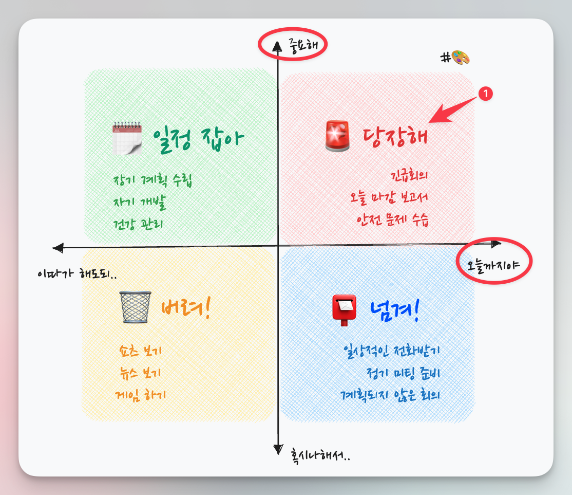 일의 우선순위를 정하는 보편적인 방법중 하나는 아이젠하워 매트릭스다. 중요성과 긴급성을 기준으로 작업을 분류한다. 이 기준에서 먼저 해야 할 것은 1사분면에 있는 중요성이 높고 마감이 가까운 작업이다.