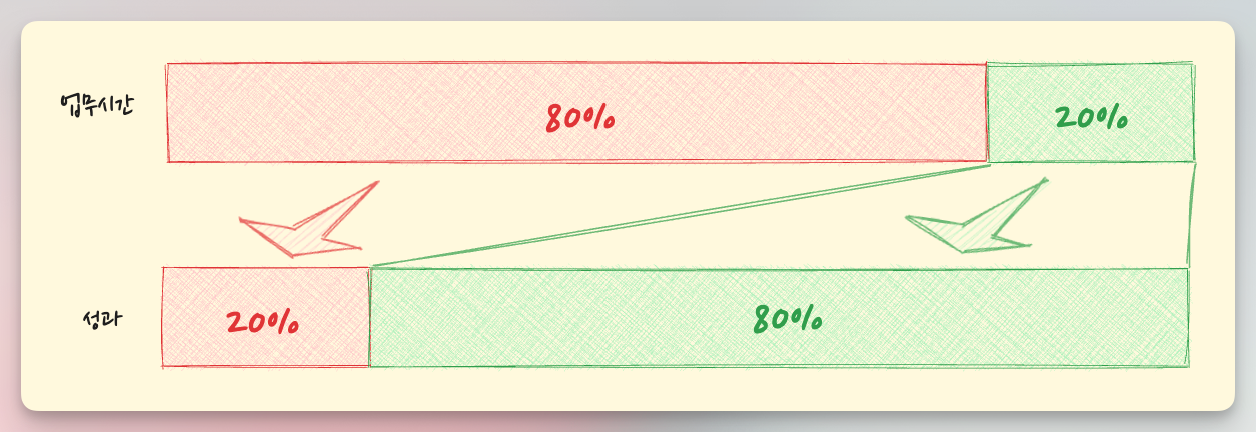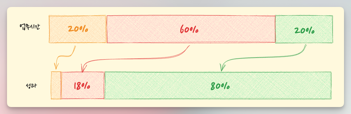 파레토 법칙은 80%의 결과가 20%의 원인에서 발생한다는 것이다. 줄여서 20:80 법칙이라고도 표현한다. 생산성 분야에도 파레토 법칙이 자주 언급된다, 이 법칙의 핵심은 성과가 투자한 시간에 비례하지 않는다는 말이다. 업무의 마지막 20% 시간에 80%의 업무량을 처리한다는 말이다.