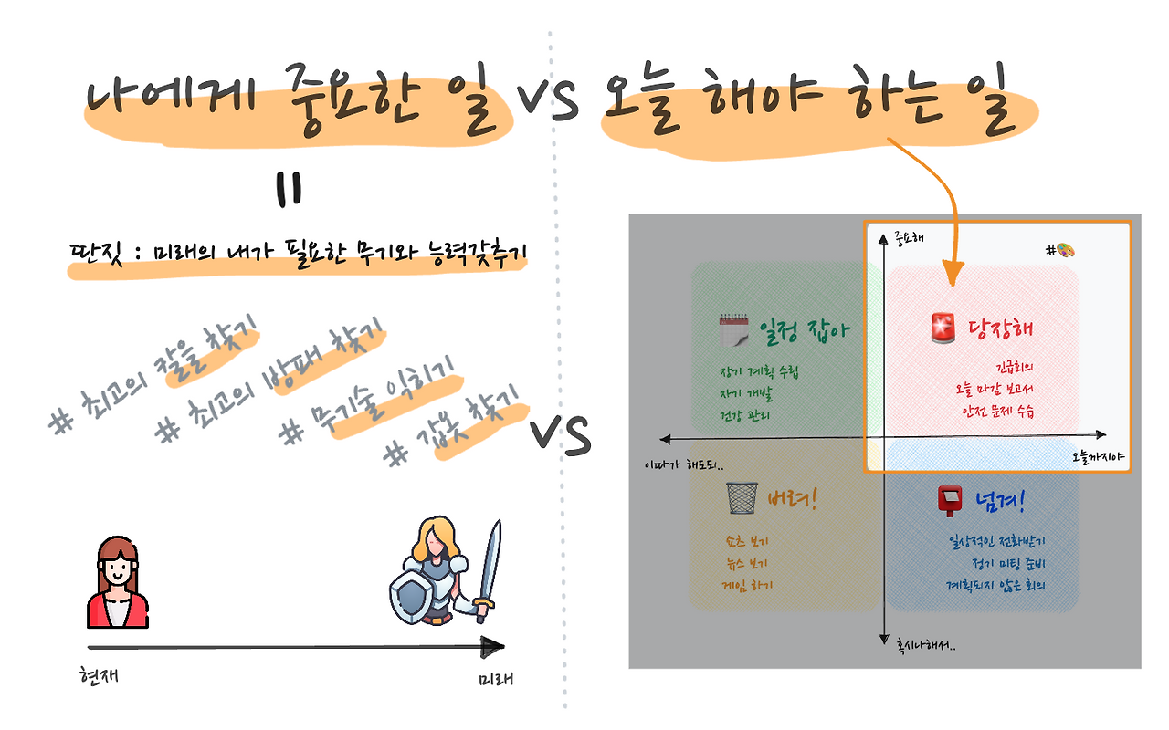 나에게 중요한 일은 미래의 내가 필요한 기술이나 능력을 갖추는 것이다. 꼭 필요하지 않더라도 갖추면 좋을 만한 것들을 위한 시간을 보내는 것이다. 훌륭한 기사가 되고 싶다면 기사가 된 내가 있으면 좋은 능력을 갖추는 행위가 나에게는 중요한 일이다. 6개월 이후의 내가 있으면 더 편해질 만한 것에 시간을 보내는 일이 궁극적으로 나에게 중요한 일이다.