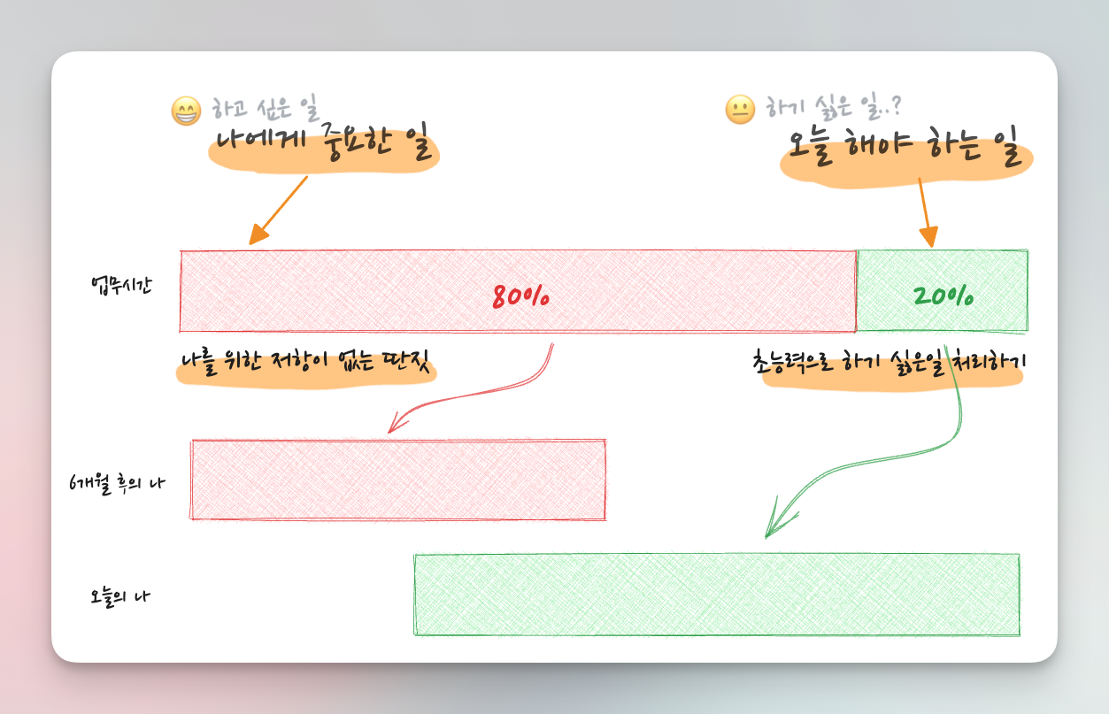 진짜 나에게 중요한 일은?단순히 미래를 위해 무언가를 열심히 해야 한다는 의미가 아니다. 미래의 내가 필요한 것들을 세분화할수록 다양한 주의력이 사용되는 형태의 작업으로 분류가 된다. 최근의 관심사와 오늘의 컨디션을 고려해서 미래 나를 위한 딴짓을 결정할 수 있다.