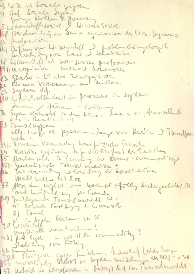 ZK I에서는 108개의 부문으로 주제가 사전 구조화되어 있으며, 이 부문들은 10개에서 4000개의 제텔을 포함합니다. 이 구조는 이미 상당히 확정되어 있고, 서로 구분되며 상대적으로 작은 지식 영역의 (개인적인) 개발 특성을 더욱 분명하게 보여줍니다. 여기서는 법, 국가 및 행정 과학 주제가 지배적이며, 조직 과학에 영향을 받은 개념도 주요 포인트를 차지하고 있습니다. 그 외에는 철학이나 사회학 부문에 명백하게 할당되는 몇 가지 부분이 있지만, 이들은 아직 확실히 주변에 위치해 있습니다.