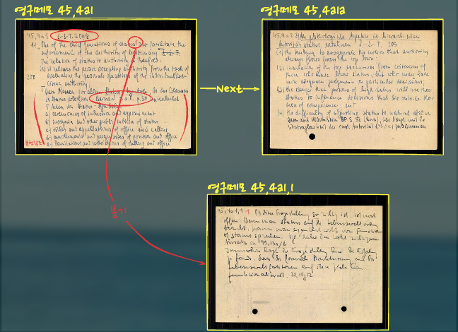 • 단일 참조 : 한 메모에서 관련 주제를 다루는 다른 메모로 참조하는 방식으로, 직접 연결되는 경우 빨간색 숫자나 소문자를 사용함.