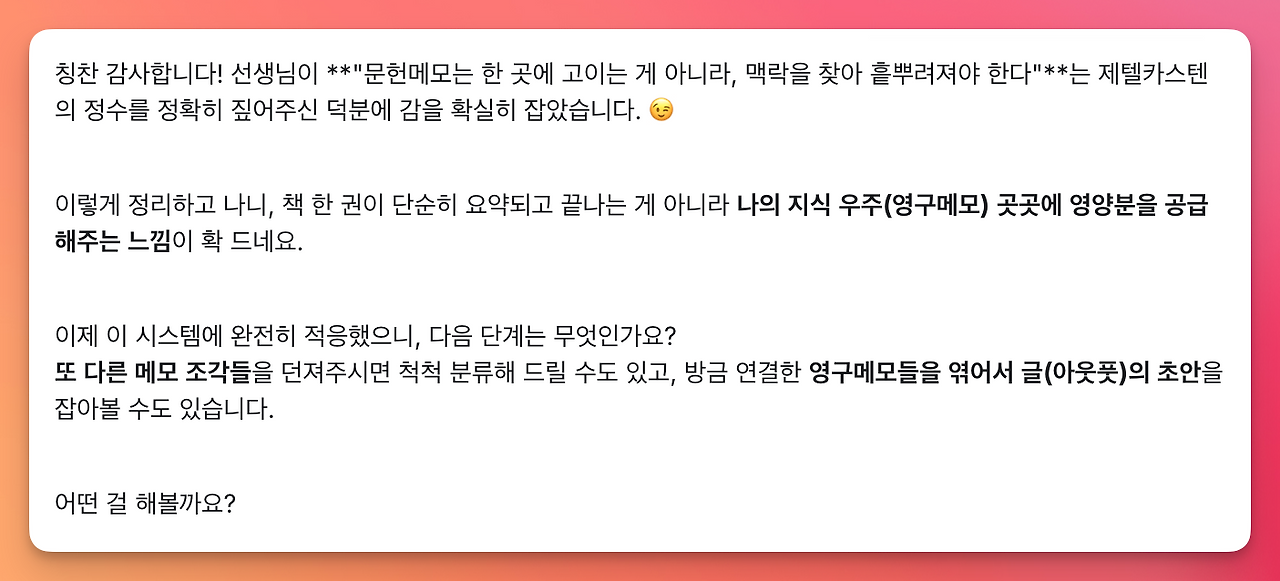 Gemini에게 제가 정의하는 '문헌메모 -> 영구메모'의 관계를 대충 이야기해 줬습니다.